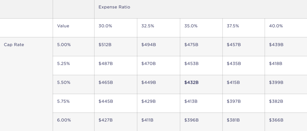 Net Operating Income (NOI) and Total Value of Real Estate: Net Operating Income is calculated as Effective Gross Income minus operating expenses. To estimate total real estate value, we applied a 5.5% capitalization rate to industry wide NOI. The table below illustrates how valuation changes across different cap rate and expense ratio scenarios.