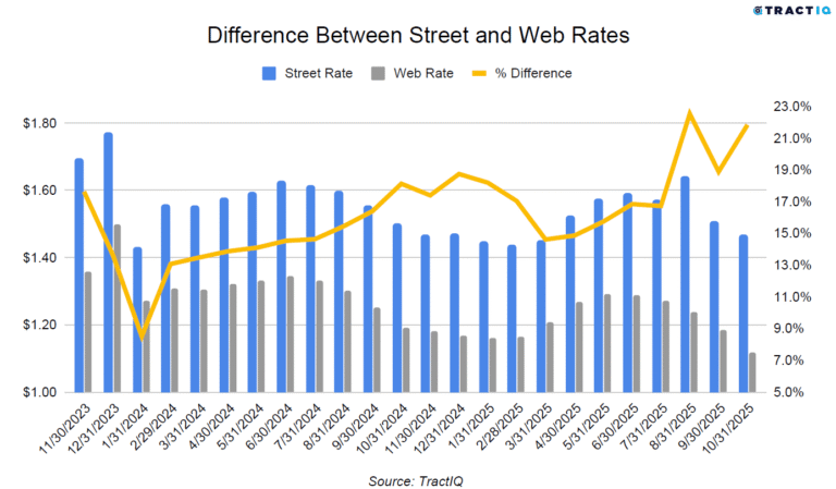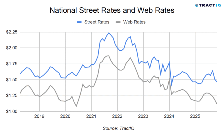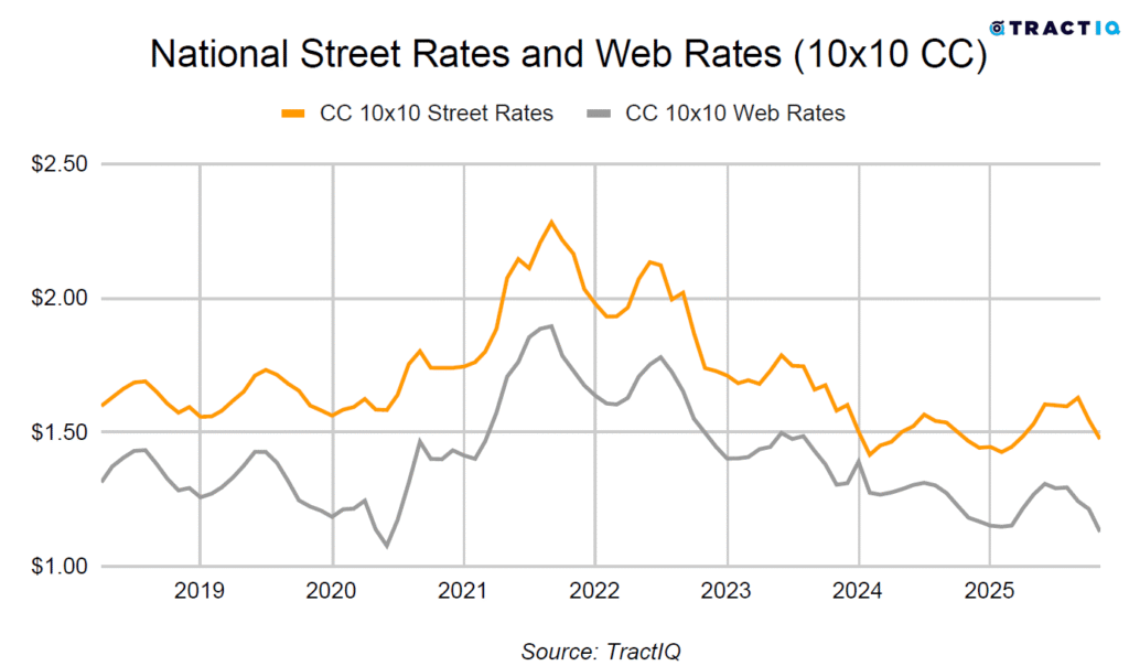 The average monthly street rate per square foot is $1.46 as of October 2025. This represents a -2.34% year-over-year growth rate. The street rate for a particular unit is the rate that a customer would be charged if they were to walk in off the “street” and rent a unit in person at the facility. Monthly street rates for 10×10 non-climate-controlled and climate-controlled units are $1.21 PSF and $1.47 PSF respectively.