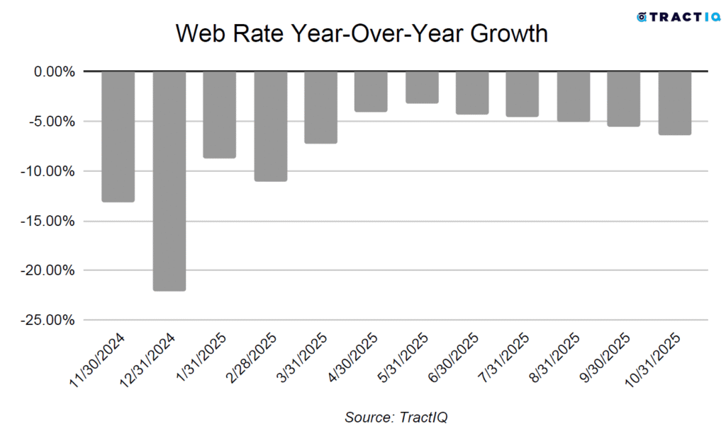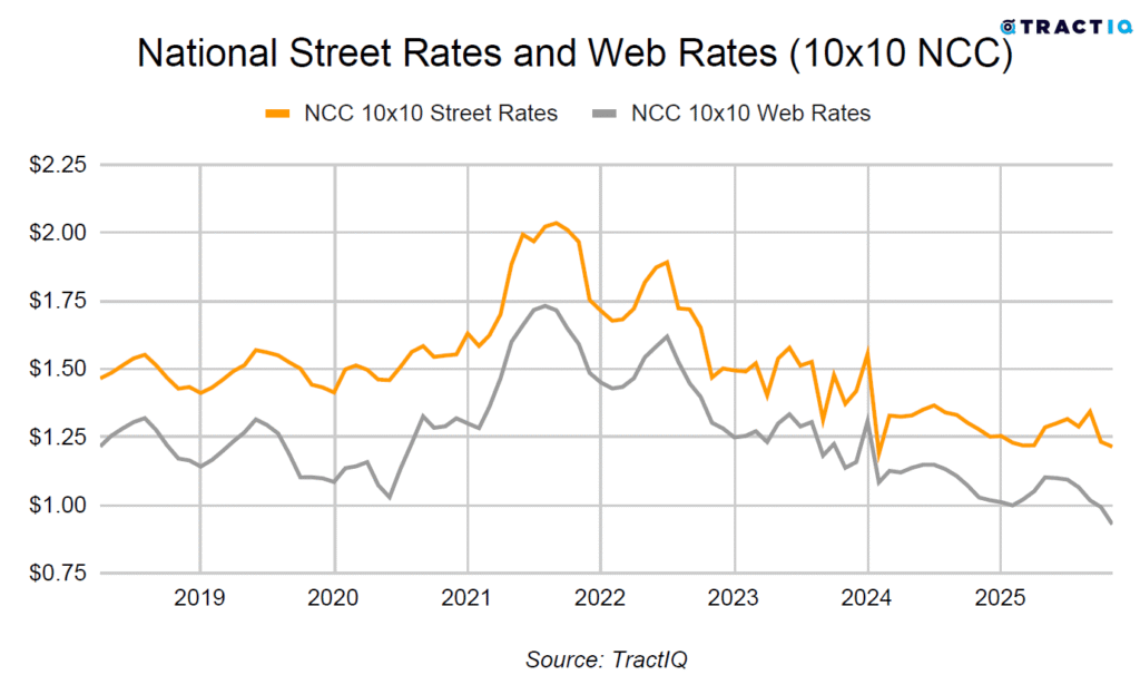 The average monthly web rate per square foot is $1.12 as of October 2025. This represents a -6.34% year-over-year growth rate. Web rates are rental prices advertised online, often discounted to attract price-sensitive shoppers. These typically include short-term promotional pricing. Monthly web rates for 10×10 non-climate-controlled and climate-controlled units are $0.93 PSF and $1.13 PSF respectively.
