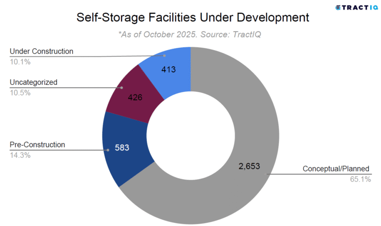 Self-storage square feet under development represents 8.1% of total existing self-storage square feet. About 65.1% of self-storage projects under development are within the conceptual/planned phase. These projects may or may not be built as they are still in the early stages of understanding feasibility and seeking approvals. Understanding supply is essential to succeed in your self-storage business.