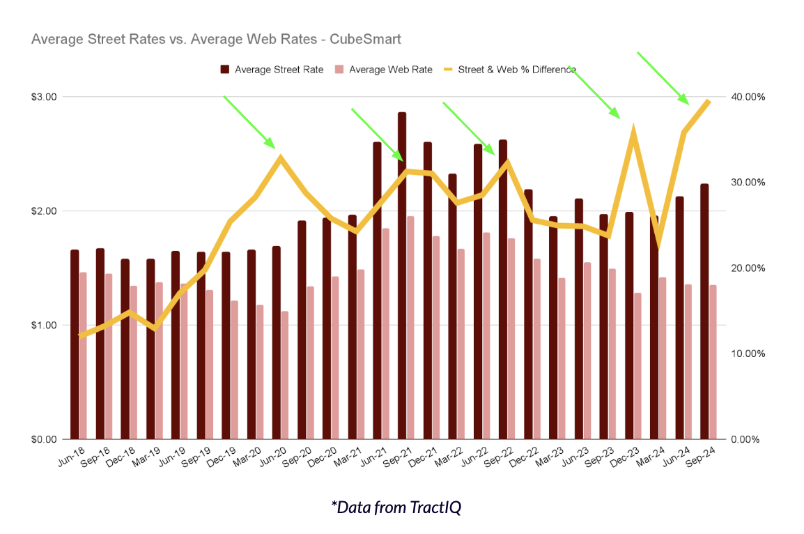 As shown in the graph above with the green arrows, the difference between Extra Space’s street rates and web rates (yellow line) at the end of 2024 is nearly the same level as it was in 2021, when demand for self-storage was the highest.