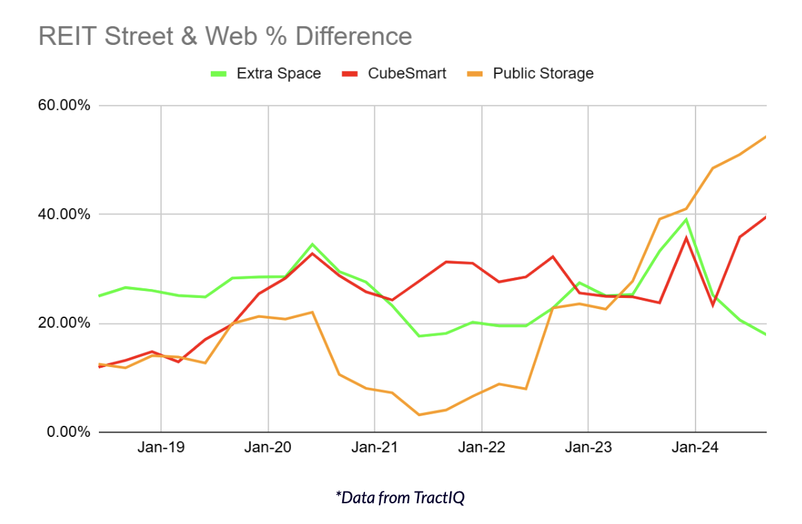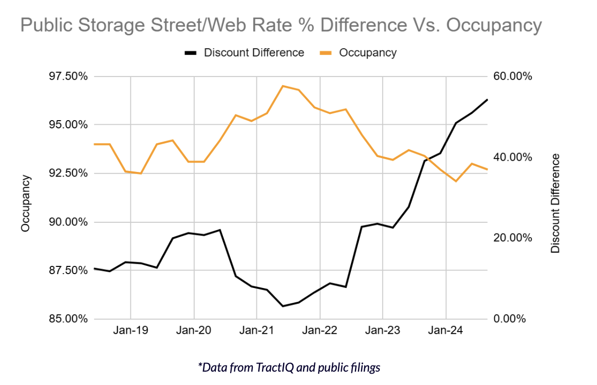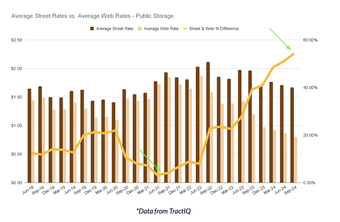 Public Storage has been the most aggressive in discounting their web rates to street rates over the last year. As of Q3 2024, the street/web rate difference is ~55%, the highest out of all the REITs currently and in recent history.