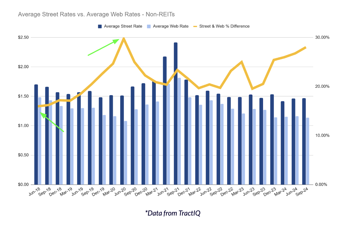 The analysis above shows street rates, web rates, and the average difference of those rates for only non-REIT operators. As shown by the green arrows above, the minimum value of the street/web rate % difference is ~18% while the maximum value is ~30% (1200 bps) – less than half of the REIT spread (2700 bps).