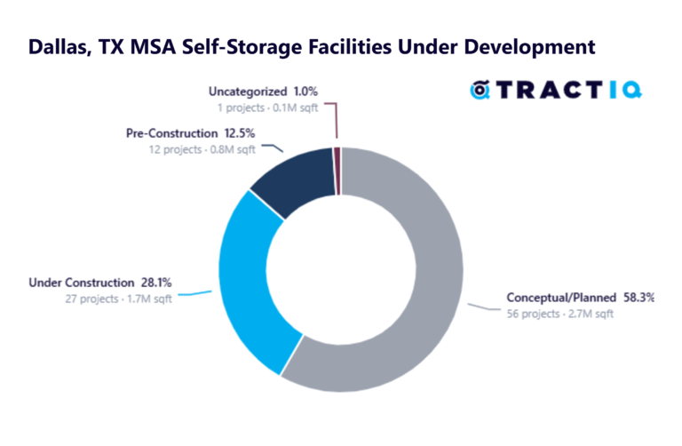Self-storage square feet under development represents 6.72% of total existing self-storage square feet. About 58.3% of self-storage projects under development are within the conceptual/planned phase.