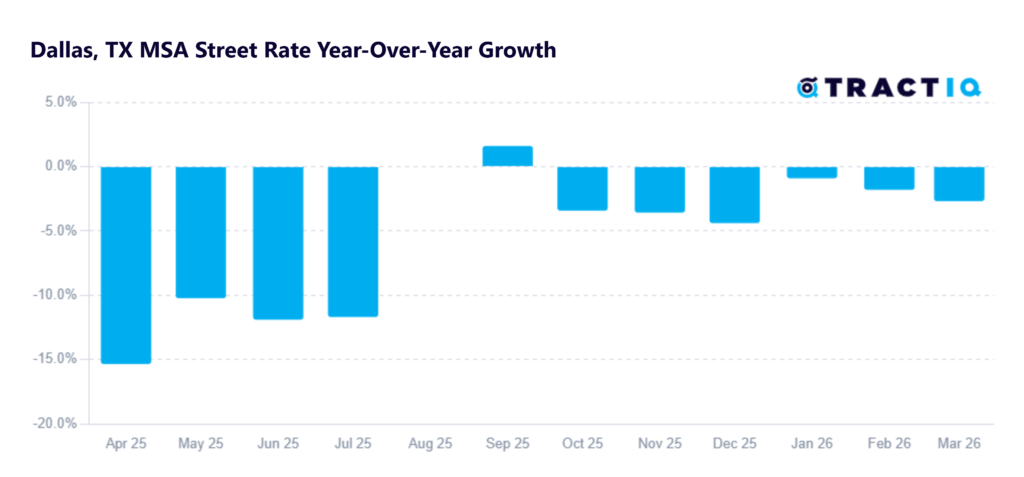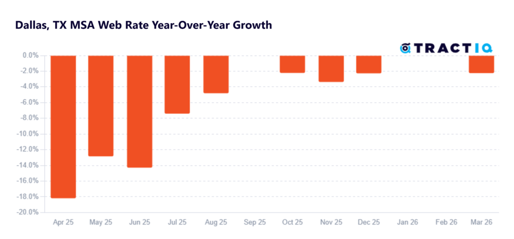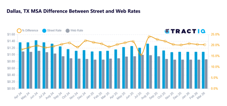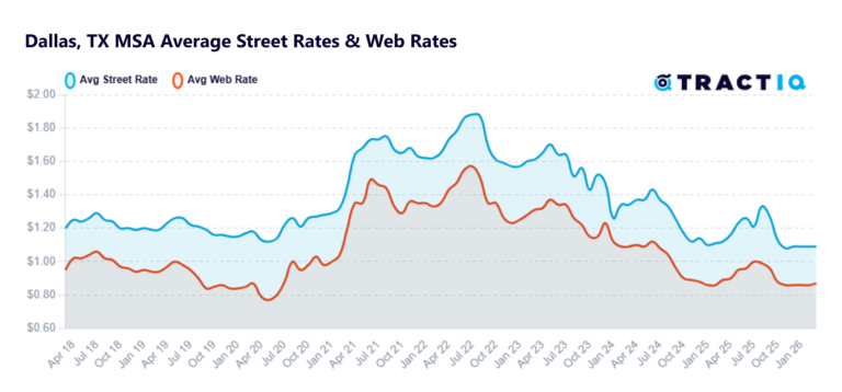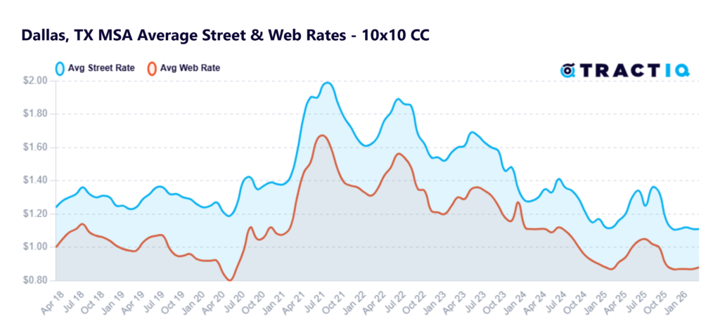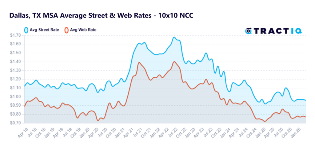 The average monthly web rate per square foot is $0.87 as of March 31st, 2026. For the Dallas, TX MSA, monthly web rates for 10×10 non-climate-controlled and climate-controlled units are $0.77 PSF and $0.88 PSF respectively.