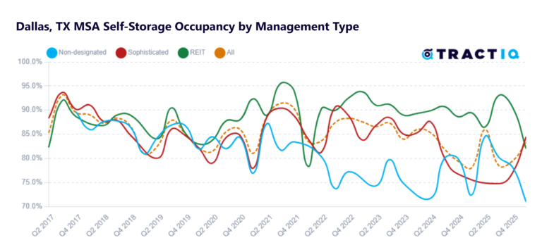 The above chart shows Dallas, TX occupancy figures by management type. As of Q4 2025, REIT occupancy was 82.0%, Non-designated operator occupancy was 71.0% and Sophisticated operator occupancy was 84.5%. From Q3 2024 to Q3 2025, occupancy was flat year-over-year.