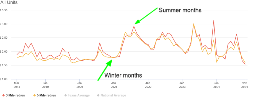 You’ll see that advertised rates can change as much as 30% or more within a year’s time because operators are constantly adjusting pricing strategies to reflect the demand in the market. With a high student population in Austin, there’s a predictable summer surge in demand that operators respond to in real-time.