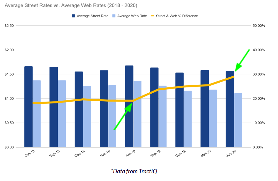 The graph above shows average street rates and average web rates across all unit sizes and facilities in the country from 2018 to 2020. The graph also shows the average difference between the street and web rates aggregated per-unit (yellow line).