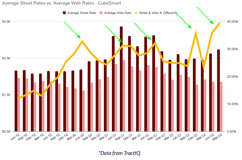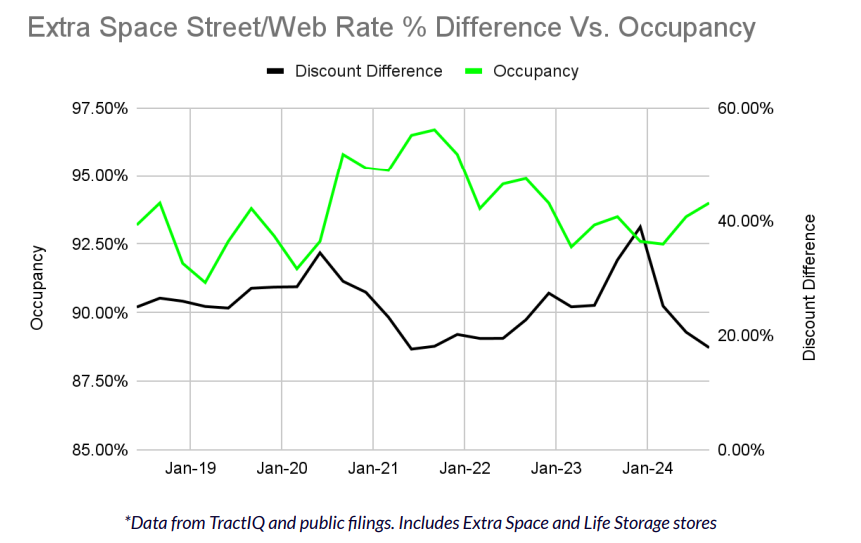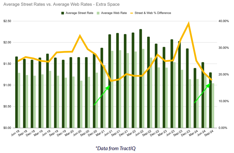 As shown in the graph above with the green arrows, the difference between Extra Space’s street rates and web rates (yellow line) at the end of 2024 is nearly the same level as it was in 2021, when demand for self-storage was the highest.