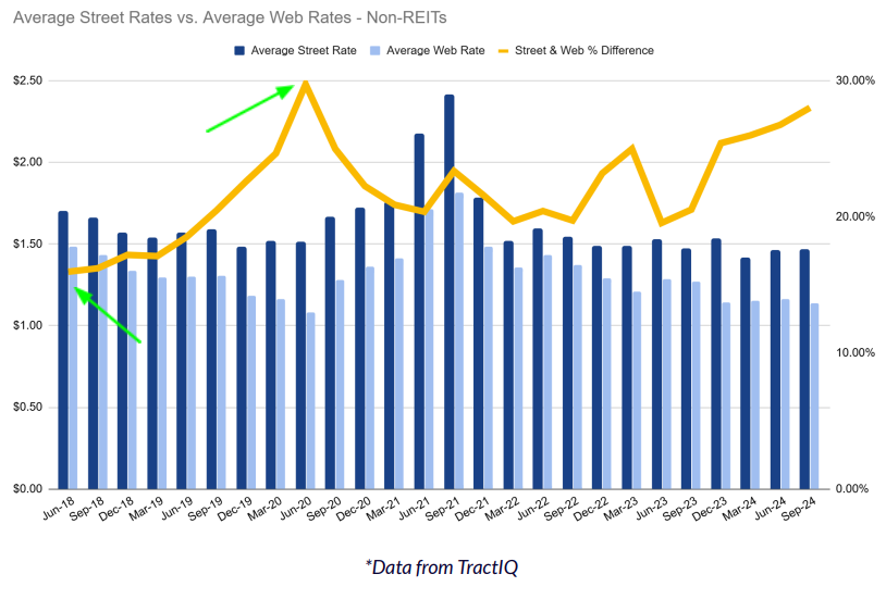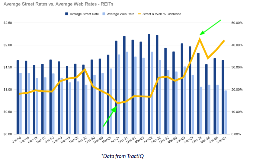 The analysis above shows street rates, web rates, and the average difference of those rates for only non-REIT operators. As shown by the green arrows above, the minimum value of the street/web rate % difference is ~18% while the maximum value is ~30% (1200 bps) – less than half of the REIT spread (2700 bps).