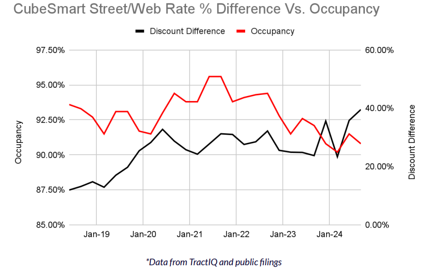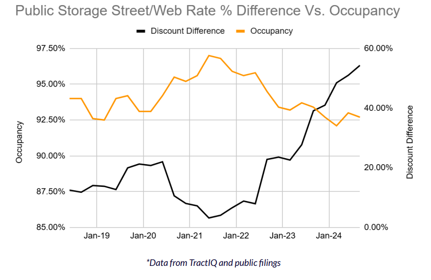 Public Storage has been the most aggressive in discounting their web rates to street rates over the last year. As of Q3 2024, the street/web rate difference is ~55%, the highest out of all the REITs currently and in recent history.