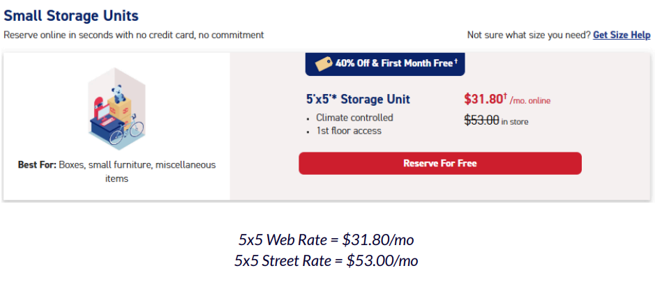 Street Rates: The street rate for a particular unit is the rate that a customer would be charged if they were to walk in off the “street” and rent a unit in person at the facility. Given that customers are less likely to price-shop in this scenario, the street rate is typically higher than the web rate.