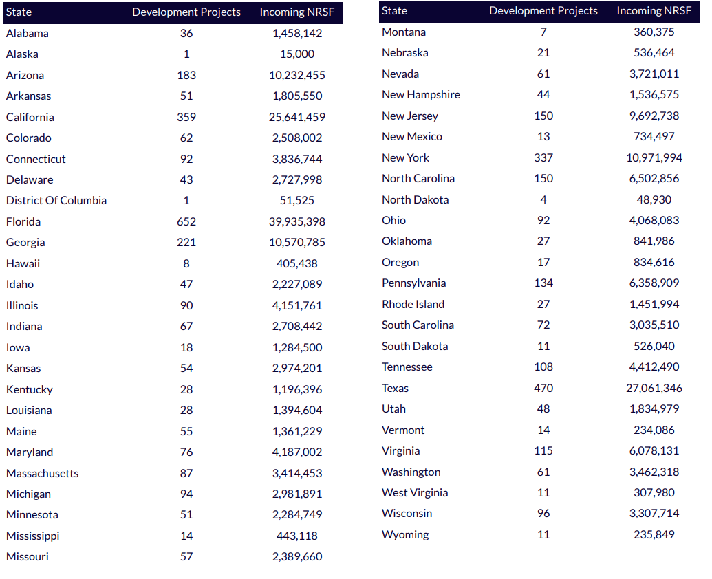 The data on the next page from TractIQ shows the number of self-storage development projects and incoming net rentable square feet by state across the nation.