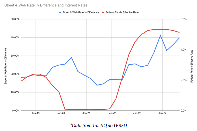The above graph overlays the Federal Funds Effective Rate against the percent difference in street and web rates. The correlation between these metrics is positive and discounting tends to lag behind interest rates.