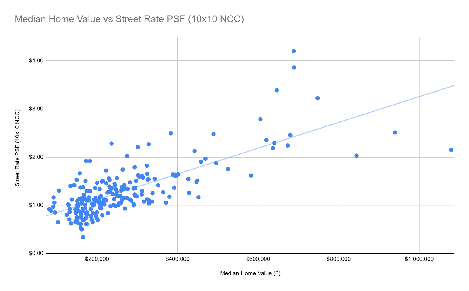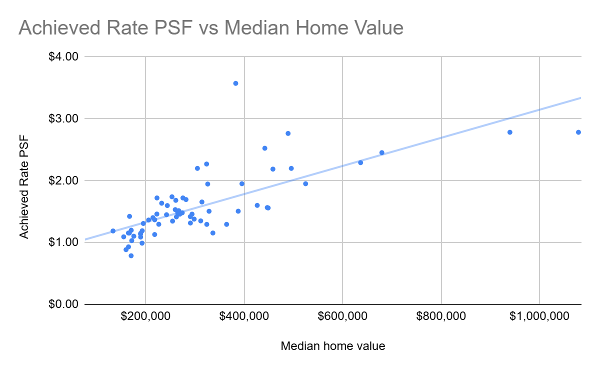 What if there was a better key metric for predicting street rates than median household income? Median home value is often overlooked and not discussed within the industry, but it is a much better predictor of street rates within a market.