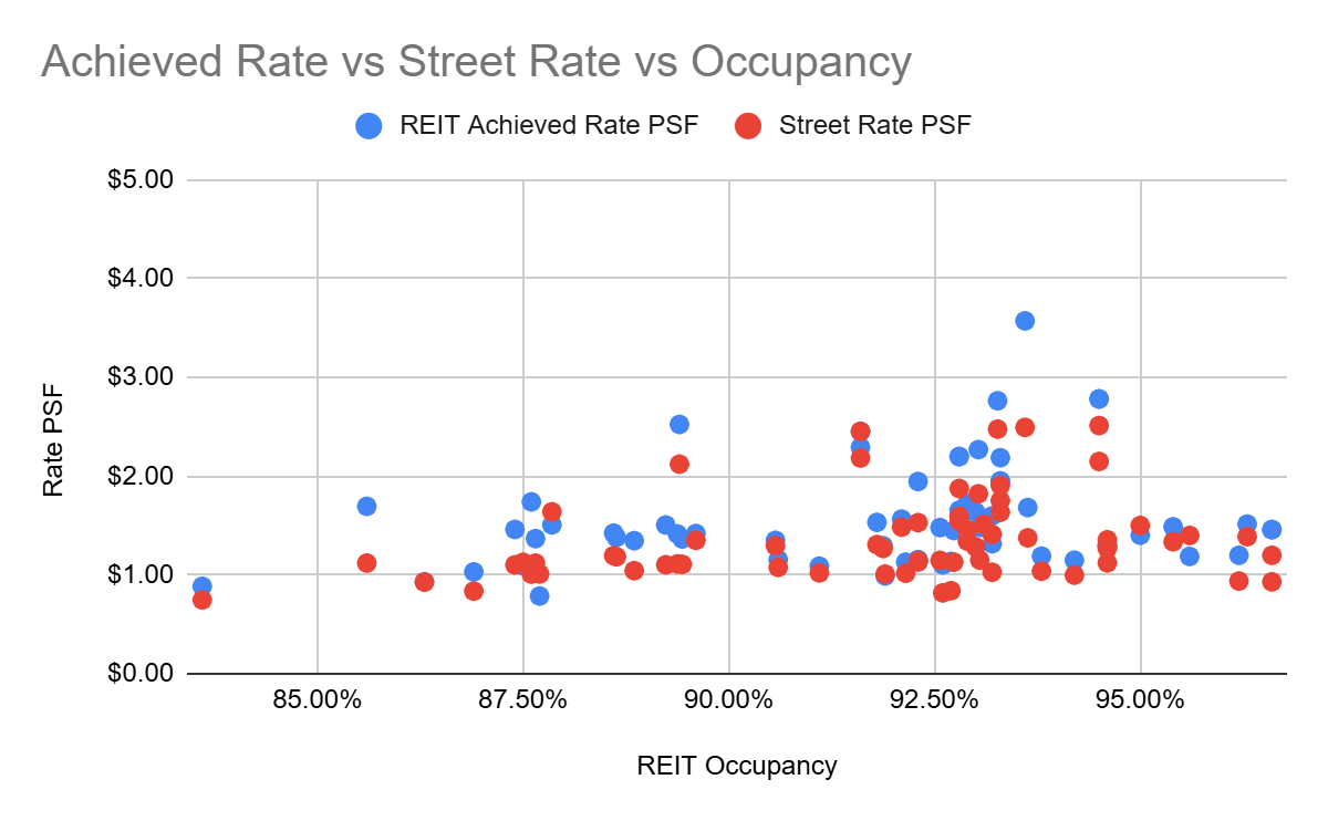 As shown in the graph above, street rates are an excellent predictor of achieved rates within a given market. The correlation between street rates and achieved rates is very strong and has an R-Squared value of 83.0%. This may come as a surprise because of the varied pricing strategies across the REITs. REITs have robust revenue management teams that change prices quickly and often when demand fluctuates. Also, REITs tend to be most aggressive in their price discounting and promotions. With street rates changing so much, it is interesting that they are still a great indicator of achieved rates within a market, according to the data.