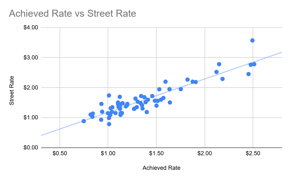 The above graph shows the correlation between achieved rates and median home value. Unsurprisingly, median home value is well-correlated with achieved rates and has an R-Squared value of 54.3%, nearly identical to the median home value/street rate correlation.