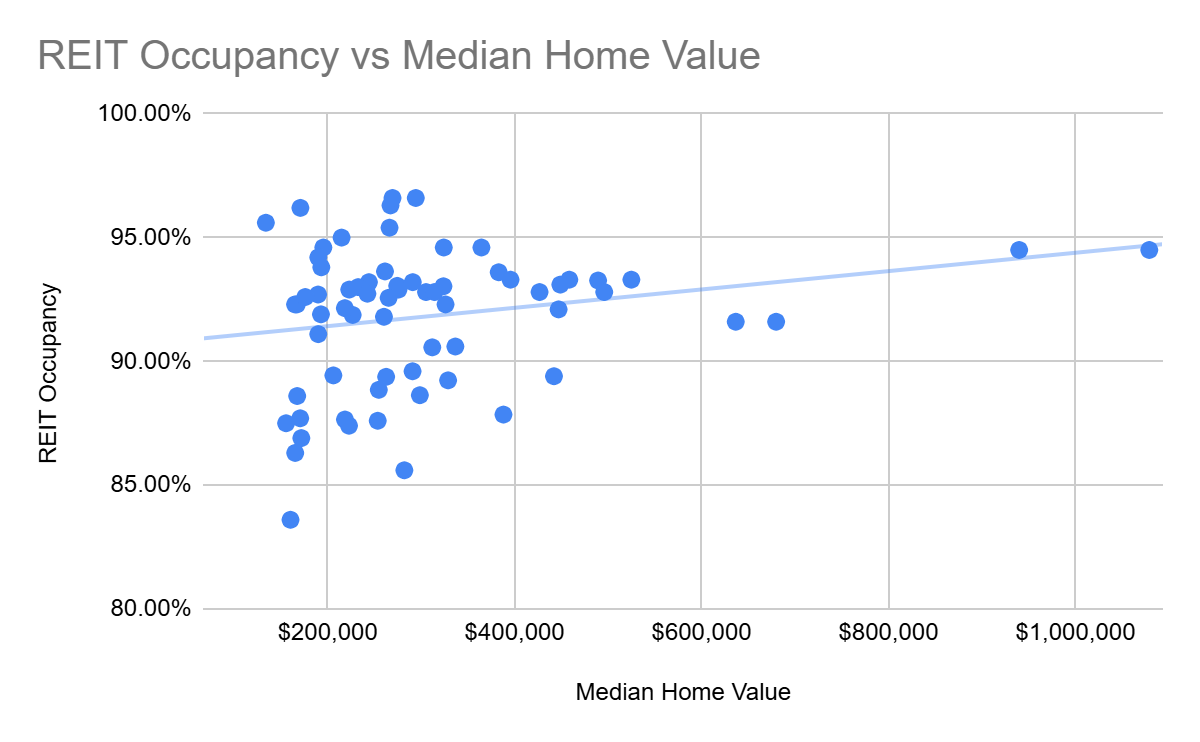 To summarize, we’ve determined that median home value is a better predictor of street rates and achieved rates than median household income. But how well correlated is median home value to occupancy? Let’s explore.