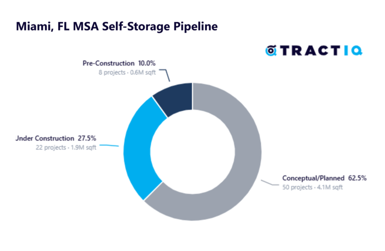 Self-storage square feet under development represents 7.53% of total existing self-storage square feet. About 69.1% of self-storage projects under development are within the conceptual/planned phase. These projects may or may not be built as they are still in the early stages of understanding feasibility and seeking approvals. Understanding supply is essential to succeed in your self-storage business.
