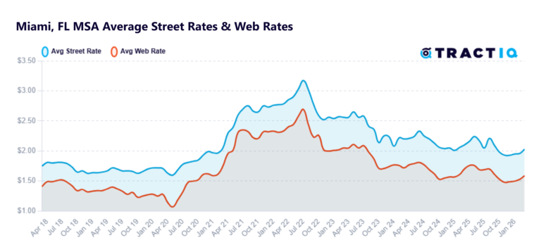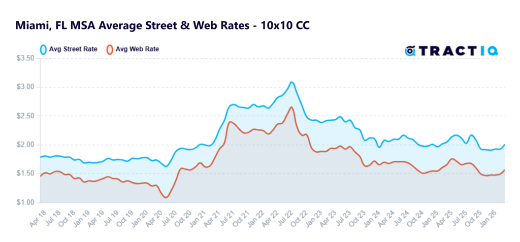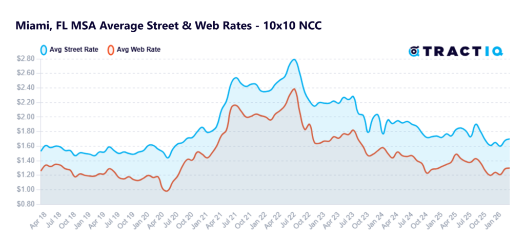 The average monthly street rate per square foot is $1.41 as of January 2026. This represents a -2.49% year-over-year growth rate. The street rate for a particular unit is the rate that a customer would be charged if they were to walk in off the “street” and rent a unit in person at the facility. Monthly street rates for 10×10 non-climate-controlled and climate-controlled units are $1.20 PSF and $1.42 PSF respectively.
