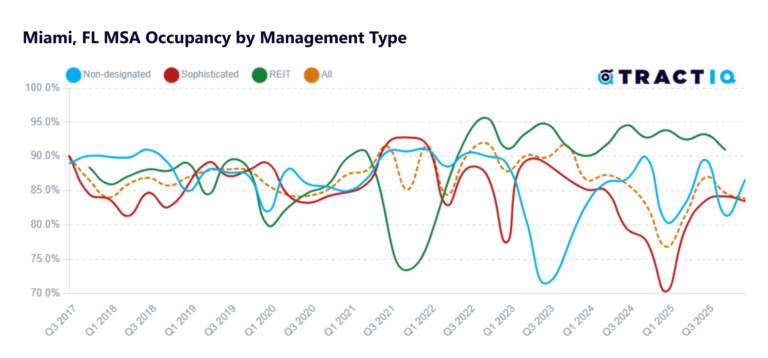 Gone are the days when assuming 90% stabilized occupancy in a market is a sound assumption. The above chart shows national occupancy figures by management type, according to thousands of CMBS-reporting self-storage facilities. As of Q2 2025, national REIT occupancy was 92.3%. As of Q3 2025, Non-designated operator occupancy was 87.2%. As of Q4 2025, Sophisticated operator occupancy was 79.8%. From Q4 2024 to Q4 2025, occupancy decreased 7.7 percentage points.