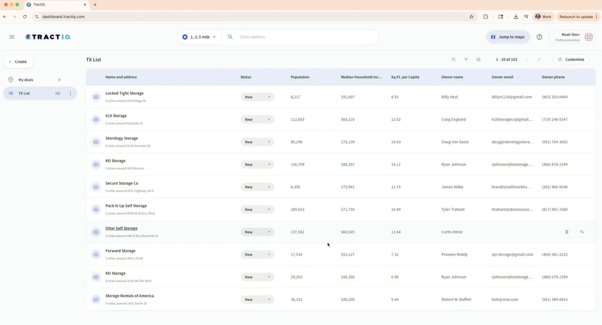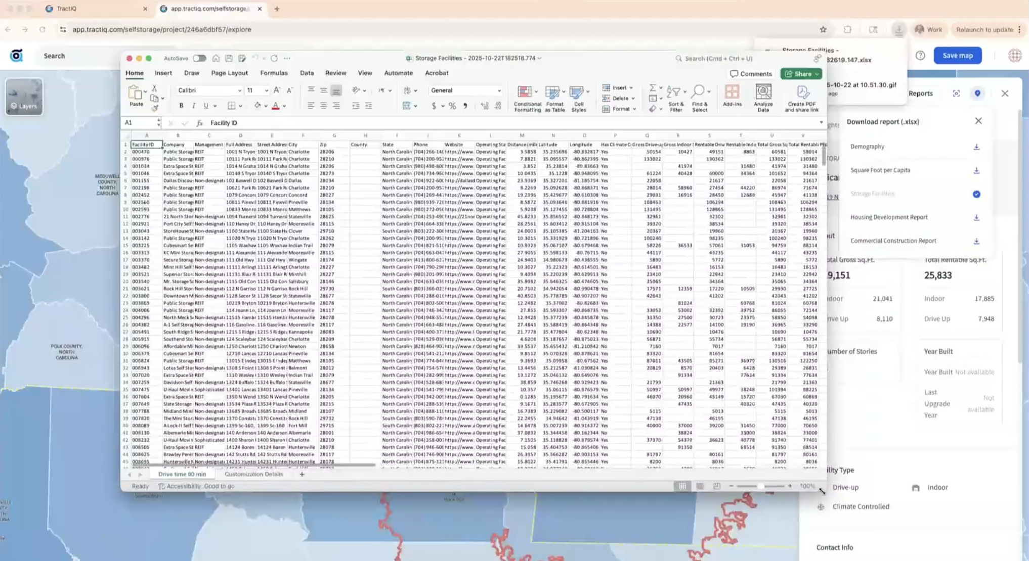 You can even export every facility in your search area to analyze rent comps, saturation, and development pipeline, all before you make your first call.